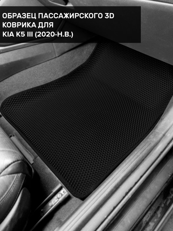 Автомобильные 3д коврики для Kia K5 III (2019-н.в.) в салон авто и багажник сделаны из инновационного полимерного материала EVA, изысканная структура в виде ячеек не дает воде, пыли и снегу разлетаться по салону машины и багажнику. 3д коврики зафиксированы на полу определенными клипсами, соответствующими Kia K5 III (2019-н.в.), и не двигаются в процессе езды.